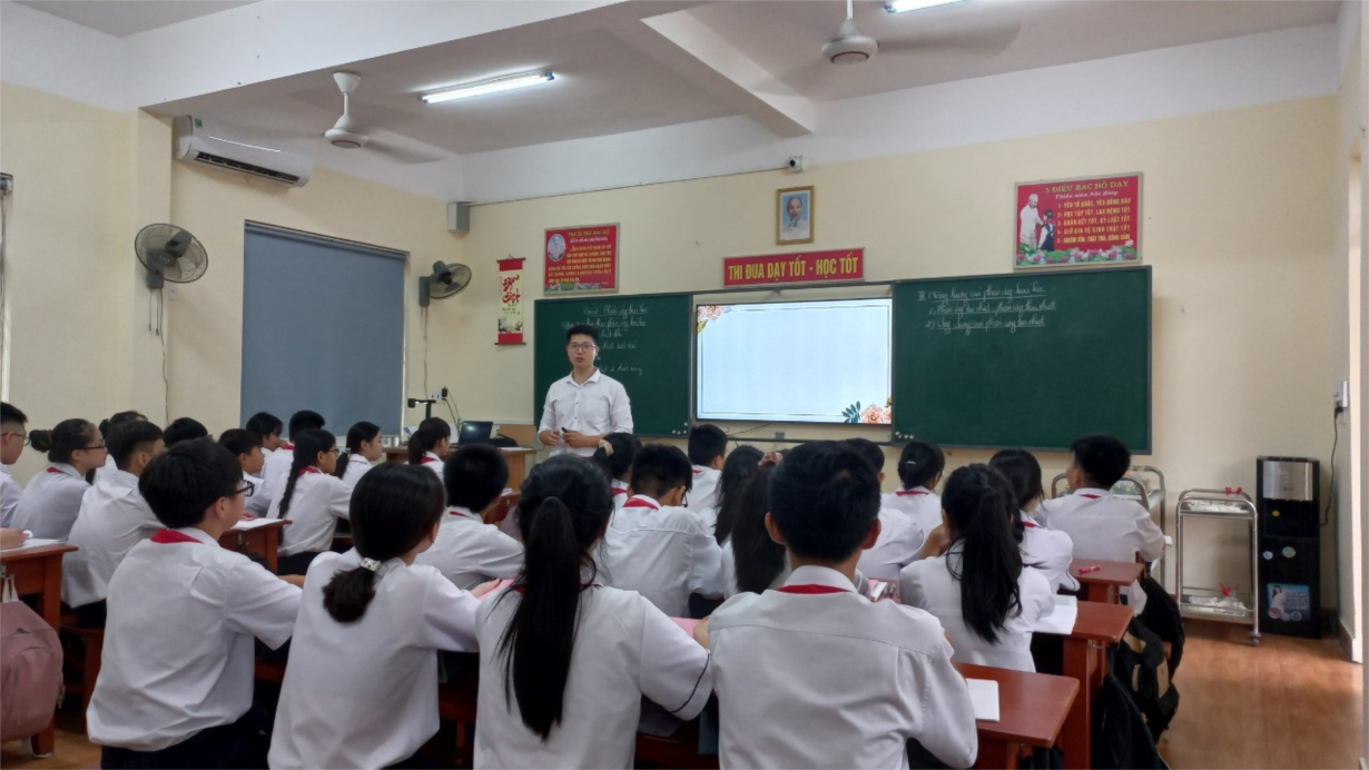 Thầy giáo Nguyễn Thành Trung và các em học sinh lớp 8B9 thực hiện tiết dạy môn KHTN 8 (phân môn Hoá học) bài 2 “Phản ứng hoá học”. Giáo viên đã đưa ra một số ví dụ trong thực tế về biến đổi vật lý, biến đổi hóa học, phản ứng tỏa nhiệt, phản ứng thu nhiệt; tiến hành một số thí nghiệm về biến đổi vật lý, biến đổi hóa học, quan sát hiện tượng và rút ra được kết luận về dấu hiệu phản ứng hóa học đã xảy ra. Các em học sinh đã nêu được khái niệm và phân biệt được biến đổi vật lý, biến đổi hóa học; nêu được khái niệm phản ứng hóa học, chất đầu và sản phẩm; chỉ ra được một số dấu hiệu chứng tỏ có phản ứng hoá học xảy ra; thực hiện được các hoạt động làm việc cá nhân, hoạt động nhóm, tìm tòi, khám phá các phản ứng hóa học. Bài dạy của thầy giáo Nguyễn Thành Trung đã ứng dụng công nghệ thông tin, lồng ghép giáo dục STEM tạo hứng thú cho người học.