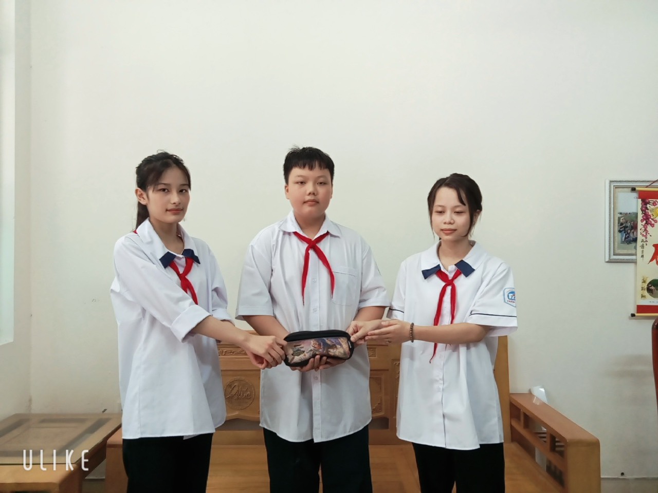 Linh lớp 9A6 nhặt được một hộp bút tại phòng học của lớp, trong hộp bút ngoài đồ dùng học tập còn có 1 triệu đồng, hai em đã mang đến gặp Ban phụ trách Đội để thầy cô thông báo tìm trả lại bạn để quên.