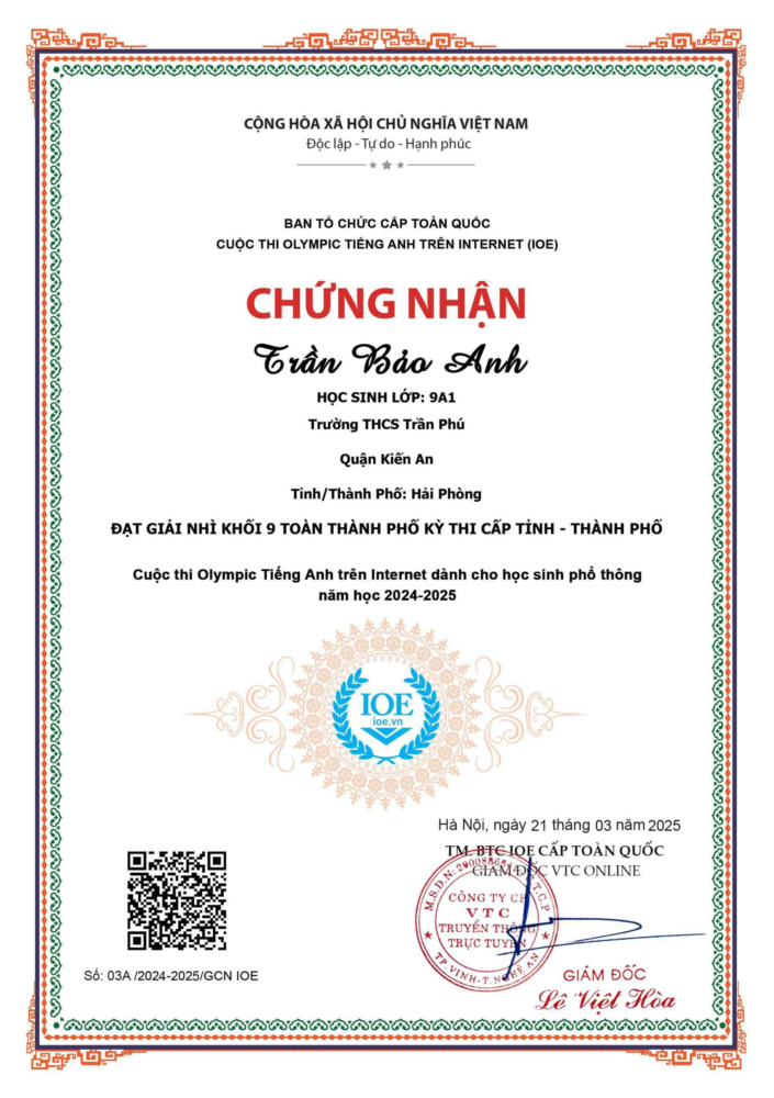 Dưới đây là giấy chứng nhận của các em đạt giải Nhì, Ba, KK toàn thành phố kỳ thi cấp tỉnh - thành phố