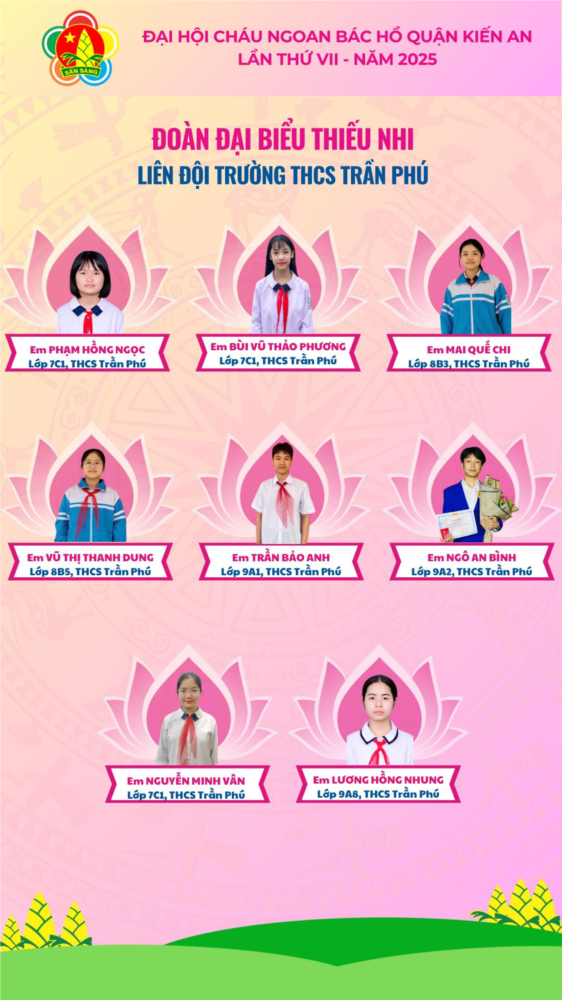 ham dự Đại hội Cháu ngoan Bác Hồ quận Kiến An lần thứ VII, năm 2025. Các em là những đội viên, thiếu niên, nhi đồng tiêu biểu nhất, xuất sắc nhất trên tất cả các mặt học tập và rèn luyện trong giai đoạn 2020 - 2025, được vinh dự tuyên dương tại Đại hội.